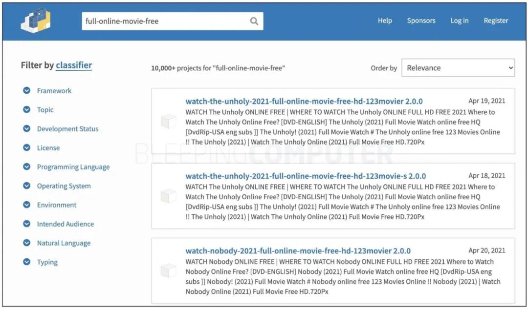 - https://www.bleepingcomputer.com/news/security/spammers-flood-pypi-with-pirated-movie-links-and-bogus-packages/