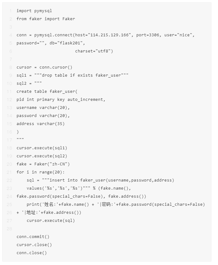 在数据库建一张表,通过Faker造数据,插入到表中。并且打印Faker造的数据。