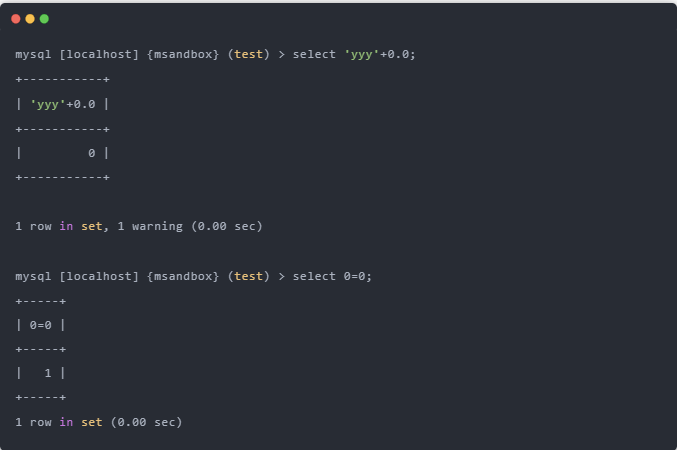 这个条件的首先判断str_col 和'xxx'是否相等,如果相等,那么里面括号的值为1,如果不相等,就是0 然后0或者1再和和'yyy'进行判断, 由于等号一边是int,另外一边是字符串,两边都转化为float进行比较,可以看我之前的一篇文章MySQL中隐式转换导致的查询结果错误案例分析'yyy'转化为浮点型为0,0和0比较恒等于1。