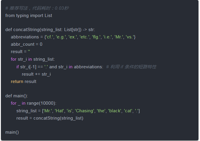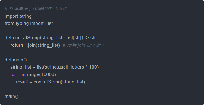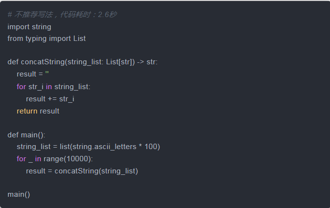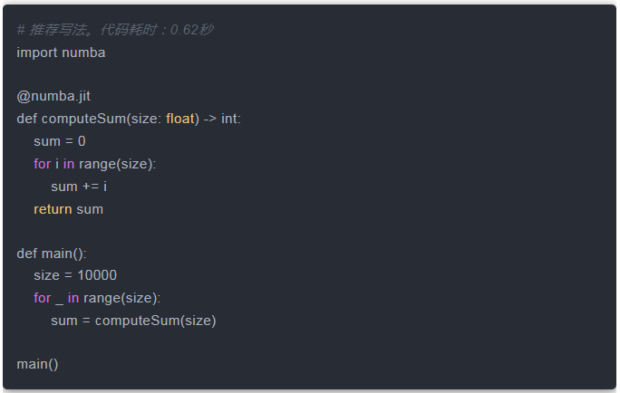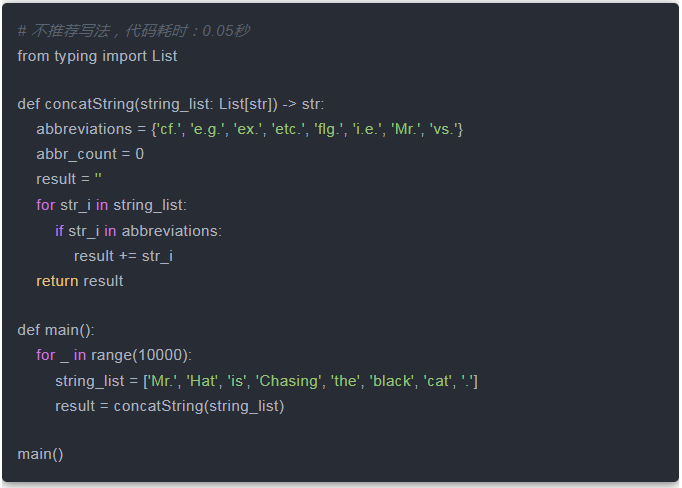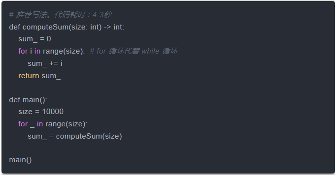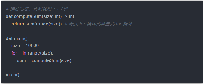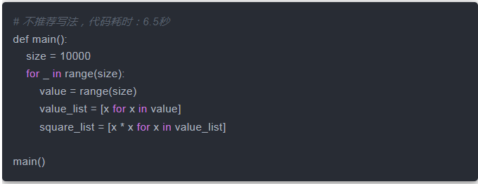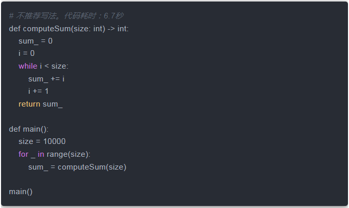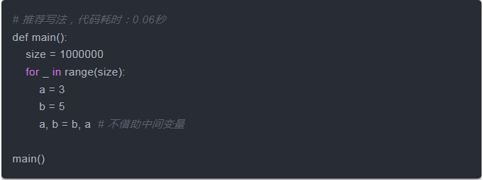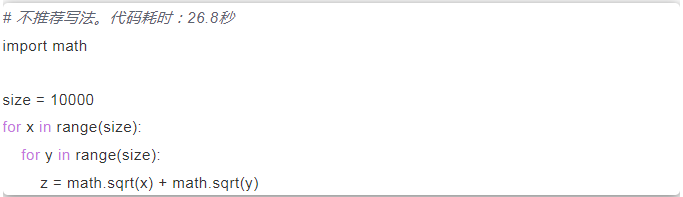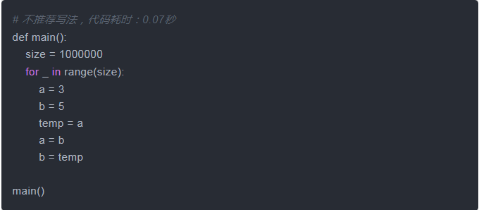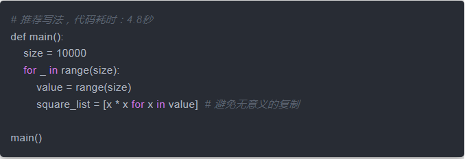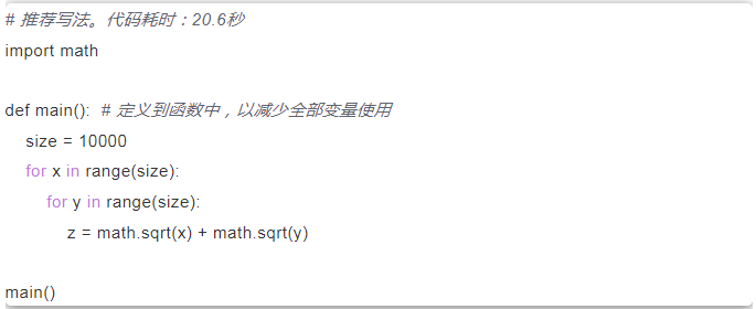 许多程序员刚开始会用 Python 语言写一些简单的脚本,当编写脚本时,通常习惯了直接将其写为全局变量,例如上面的代码。但是,由于全局变量和局部变量实现方式不同,定义在全局范围内的代码运行速度会比定义在函数中的慢不少。通过将脚本语句放入到函数中,通常可带来 15% - 30% 的速度提升。