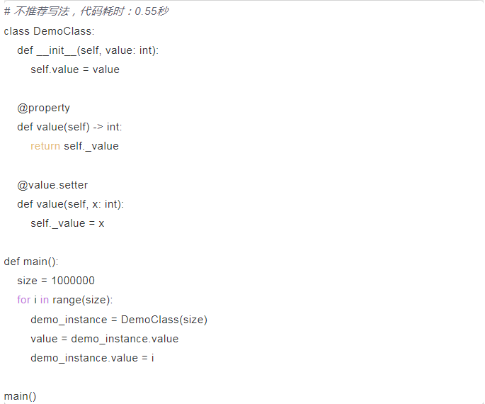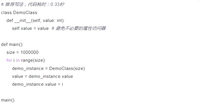 任何时候当你使用额外的处理层(比如装饰器、属性访问、描述器)去包装代码时,都会让代码变慢。大部分情况下,需要重新进行审视使用属性访问器的定义是否有必要,使用getter/setter函数对属性进行访问通常是 C/C++ 程序员遗留下来的代码风格。如果真的没有必要,就使用简单属性。