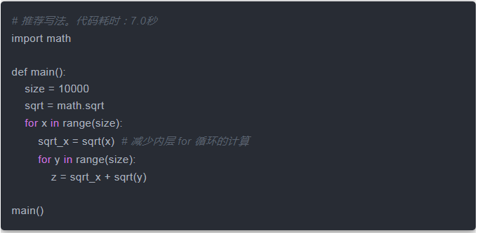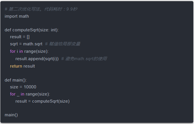 在第 1 节中我们讲到,局部变量的查找会比全局变量更快,因此对于频繁访问的变量sqrt,通过将其改为局部变量可以加速运行。