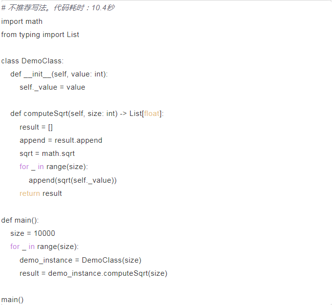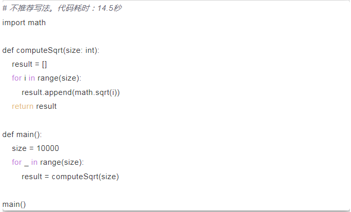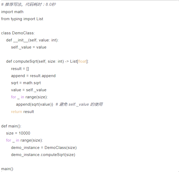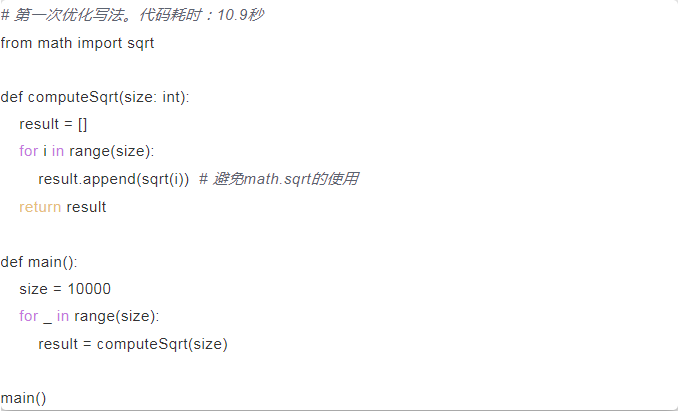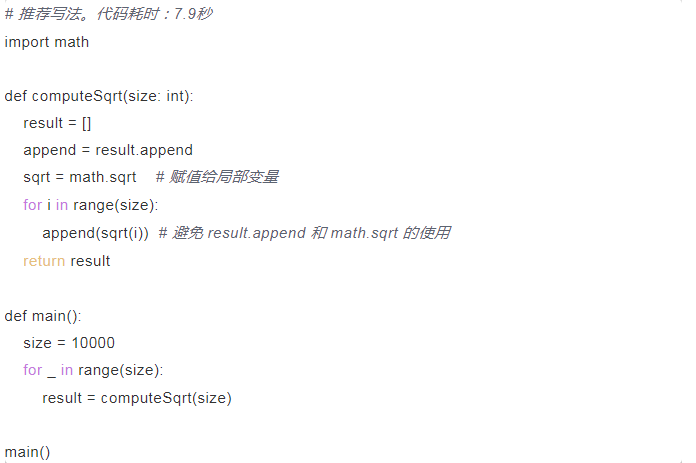 除了math.sqrt外,computeSqrt函数中还有.的存在,那就是调用list的append方法。通过将该方法赋值给一个局部变量,可以彻底消除computeSqrt函数中for循环内部的.使用。