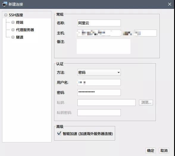 在弹出的窗口中输入你的用户名和密码,认证方式你也可以选择其他的方式,我这里是使用用户名和密码连接测试的阿里的一台linux服务器