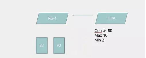 我现在运行了一个RS-1,RS-1下面管理两个pod,然后我再定义一个HPA,这个HPA定义是基于这个RS-1来定义的,当我们的CPU大于80的时候就进行扩展,扩展的最大值是10个最小值是两个,也就以为这HPA会去监控这些POD的资源利用率,当CPU达到80的时候HPA就会去新建出来新的pod直到达到他HPA的最大值10个,也就是cpu只有在大于或等于80的时候HPA才会去创建pod,如果不满足这个条件就不会再进行创建。一旦利用率变低之后这里的pod就会被回收。但是最小只能删到2因为这里定义了最小个数为2,所以HPA就会达成一个水平制度扩展的目的。