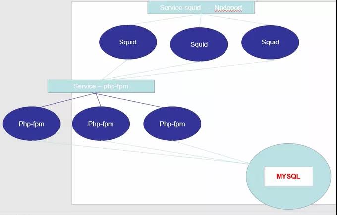 也就意味这首先我们要构建一个 apache 加入到 fpm 的结构集群,然后在构建 mysql 集群正在构建squid 集群。假如我们想把这个结构放在我们的 k8s 集群中运行的话。