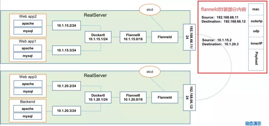 到达流程:首先我们的 web app2 pod 想要把数据包发送到 backend ,这时候 web app2 的数据包源地址写自己的 10.1.15.2/24 目标要写 backend 的 10.1.20.3/24 。由于不是在同一台主机所以 webapp2 先发送到他的网关也就是 docker0 的 IP 10.1.15.1/24,而 docker0 上会有对应的函数把这个数据包抓到我们的 flannel0 并且在flannel0 上会有一堆的路由表记录。这个路由表记录是从我们的 etcd 里面获取到的,写入到我们当前的主机判断路由到底到那台机器。