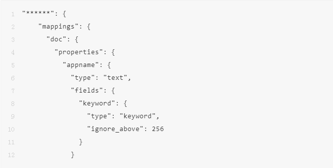 以下是截取了某日志 index 下的部分 mapping 结构,ES 对字符串类型会默认定义成 text ,同时为它定义一个叫做 keyword 的子字段。这两的区别是:text 类型会进行分词, keyword 类型不会进行分词。
