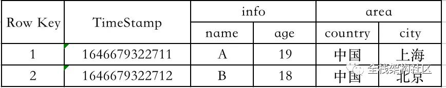 Row key 是主键,按照字典序排序。TimeStamp 是版本号。info 和 area 都是列簇(column Family),列簇将表进行横向切割。name、age 叫做列,属于某一个列簇,可进行动态添加。Cell 是具体的 Value 。