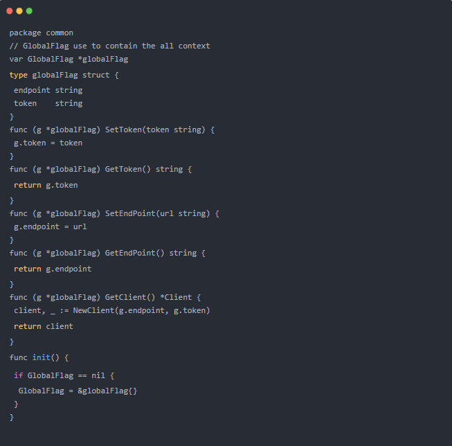 auth函数实现认证并不难, 关键是auth过后的token 如何传递给后面的子命令使用, 参考etcdctl和docker部分都使用上下文来实现这个需求, cobra里面也没有地方给我存上下文, 因此需要专门用一个模块来保持 全局的上下文, 因此需要手动实现一个common包。