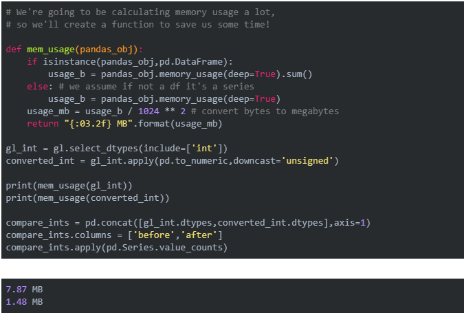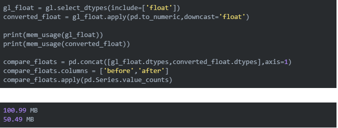 我们可以使用函数 pd.to_numeric() 来对我们的数值类型进行 downcast(向下转型)操作。我们会使用 DataFrame.select_dtypes 来选择整型列,然后我们会对其数据类型进行优化,并比较内存用量。