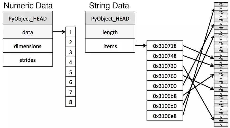 下面这幅图给出了以 NumPy 数据类型存储数值数据和使用 Python 内置类型存储字符串数据的方式。