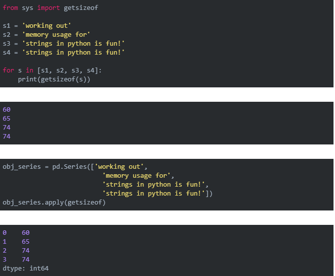 你可以看到,当存储在 pandas series 时,字符串的大小与用 Python 单独存储的字符串的大小是一样的。