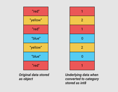 你可以看到每个不同值都被分配了一个整型值,而该列现在的基本数据类型是 int8。这一列没有任何缺失值,但就算有,category 子类型也能处理,只需将其设置为 -1 即可。