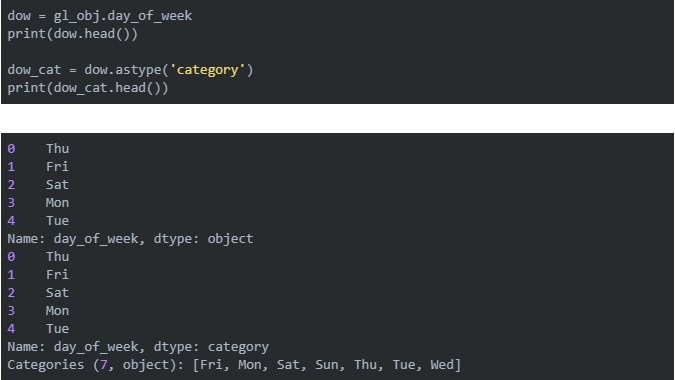 为了了解当我们将其转换成 categorical 类型时究竟发生了什么,我们拿出一个 object 列来看看。我们将使用数据集的第二列 day_of_week.