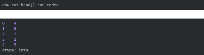 在下面的代码中,我们使用了 Series.cat.codes 属性来返回 category 类型用来表示每个值的整型值。