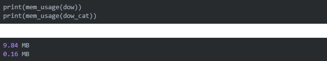 9.8 MB 的内存用量减少到了 0.16 MB,减少了 98%!注意,这个特定列可能代表了我们最好的情况之一——即大约 172,000 项却只有 7 个不同的值。