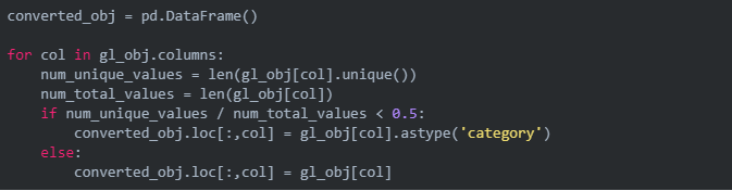 我们将编写一个循环函数来迭代式地检查每一 object 列中不同值的数量是否少于 50%;如果是,就将其转换成 category 类型。