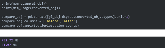 在这个案例中,所有的 object 列都被转换成了 category 类型,但并非所有数据集都是如此,所以你应该使用上面的流程进行检查。