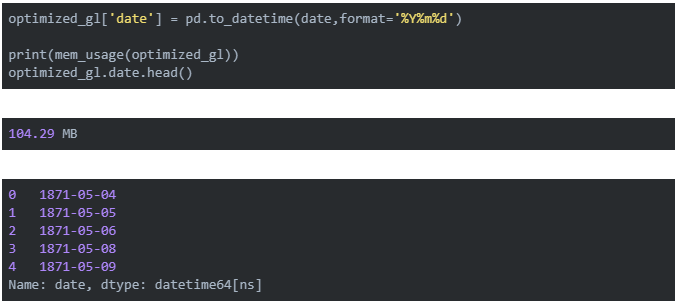 Wow,进展真是不错!我们还可以执行另一项优化——如果你记得前面给出的数据类型表,你知道还有一个 datetime 类型。这个数据集的第一列就可以使用这个类型。