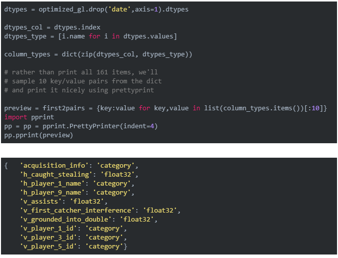 首先,我们可将每一列的最终类型存储在一个词典中,其中键值表示列名称,首先移除日期列,因为日期列需要不同的处理方式。