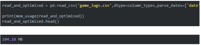 通过优化这些列,我们成功将 pandas 的内存占用从 861.6MB 减少到了 104.28MB——减少了惊人的 88%!