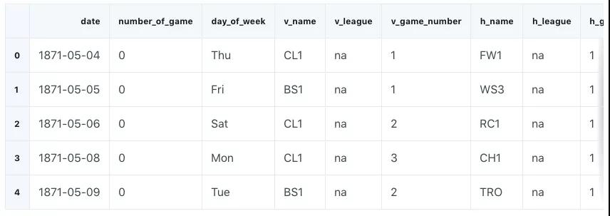 这些数据原来分成了 127 个不同的 CSV 文件,但我们已经使用 csvkit 合并了这些数据,并在第一行增加了列名称。如果你想下载本文所用的这个数据版本,请访问:https://data.world/dataquest/mlb-game-logs。