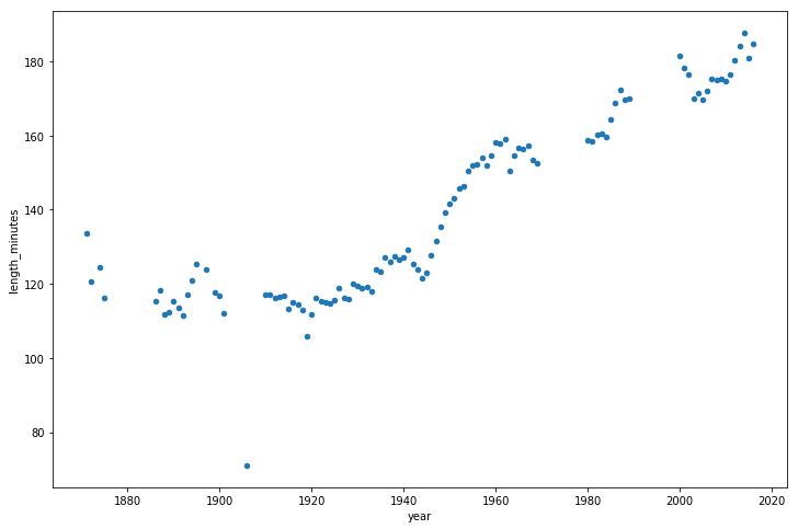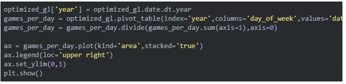 我们可以看到在 1920 年代以前,星期日的棒球比赛很少,但在上个世纪后半叶就变得越来越多了。