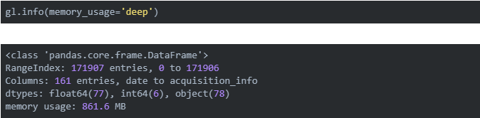 我们可以看到,我们有 171,907 行和 161 列。pandas 会自动为我们检测数据类型,发现其中有 83 列数据是数值,78 列是 object。object 是指有字符串或包含混合数据类型的情况。