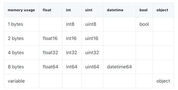 pandas 中的许多类型都有多个子类型,这些子类型可以使用更少的字节来表示每个值。比如说 float 类型就包含 float16、float32 和 float64 子类型。类型名称中的数字就代表该类型表示值的位(bit)数。比如说,我们刚刚列出的子类型就分别使用了 2、4、8、16 个字节。下面的表格给出了 pandas 中最常用类型的子类型: