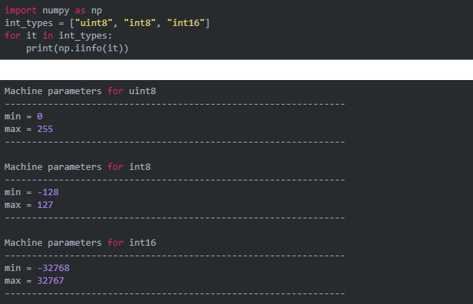 我们可以使用 numpy.iinfo 类来验证每个整型数子类型的最大值和最小值。举个例子: