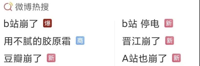 而在7月13日,热搜上也是一片“崩坏”。起因是因为B站崩了,看不了视频的用户又冲向了其他网站,之后A站、豆瓣、晋江文学都出现了不同程度的访问故障。B站7000多万日活网友的威力可见一斑。