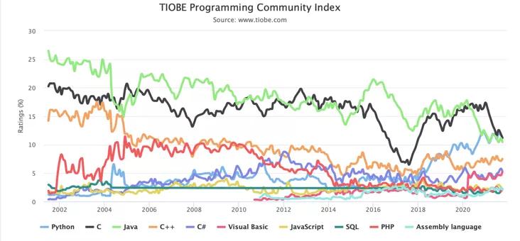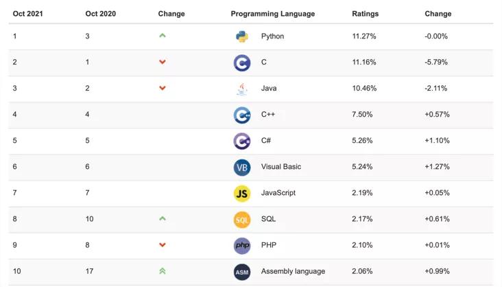 2021 年 10 月 TIOBE 指数榜:Python 超越 C 语言成 20 多年来的新霸主