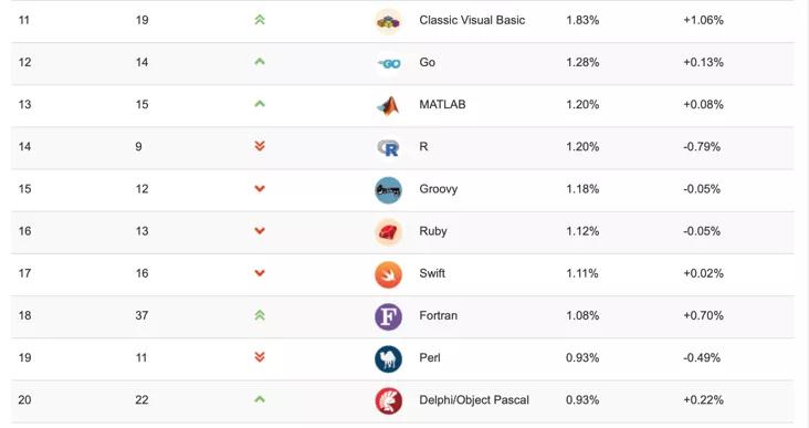 榜单中第 11-20 位的分别为:评级为 1.83% 的 Classic Visual Basic ,评级为 1.28% 的 Go 、评级为 1.20% 的 MATLAB、评级为 1.20% 的 R 、评级 1.18% 的 Groovy、评级为 1.12% 的 Ruby,评级为 1.11% 的 Swift、评级为 1.08% 的 Fortran、评级为 0.93% 的 Perl、评级为 0.93% 的 Delphi/Object Pascal。