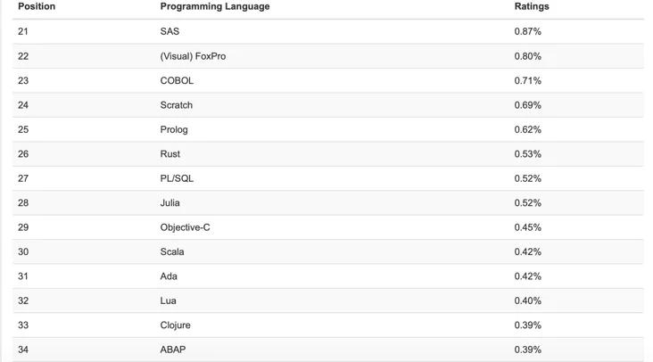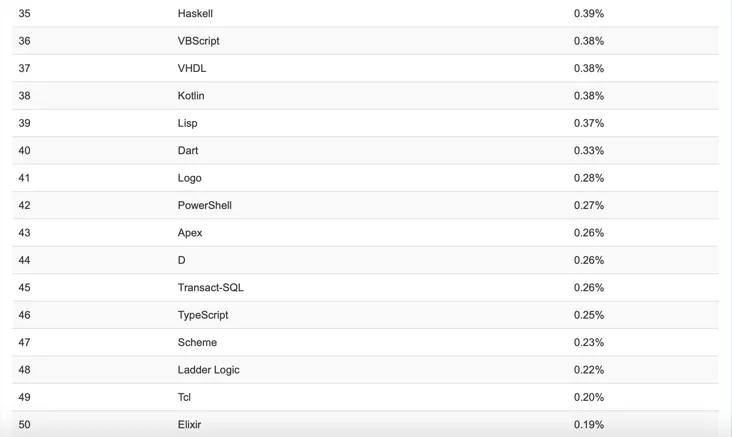 下面列出了榜单中前 50 种编程语言里 21-50 位的排名,通过对比也可以看到各自的变化。