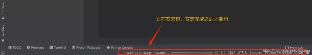 点击左上角“File”→点击“Settings”→找到Project下面的“Python interpreter”→点击“+”→输入你想安装的包的名字,例如“pygame”,然后点击下面的“Install Package”就开始安装了,安装完成就可以用了。