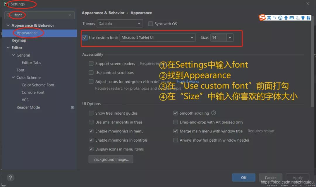 那么你就需要去调整一下菜单界面的文字大小了,点击左上角的“File”,选择“Settings”,输入“font”,找到“Appearance”,在“Use custom font”前面打勾之后,就可以在后面的Size里面选择你喜欢的字体大小了。