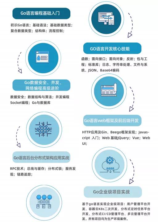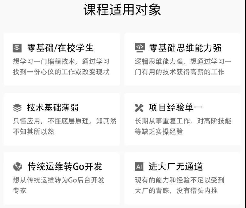 本次课程不仅针对零基础学员,从零开始手把手教会您 Golang 的核心基础内容。还覆盖现在最主流的 Go 开发全栈技术+微服务体系,学完可以达到 Go 高级工程师的水平。适合运维人员、IT 行业人士、开发从业者、转行开发人员提升学习,尤其是运维人员学习后薪资和能力会有大幅度提升!