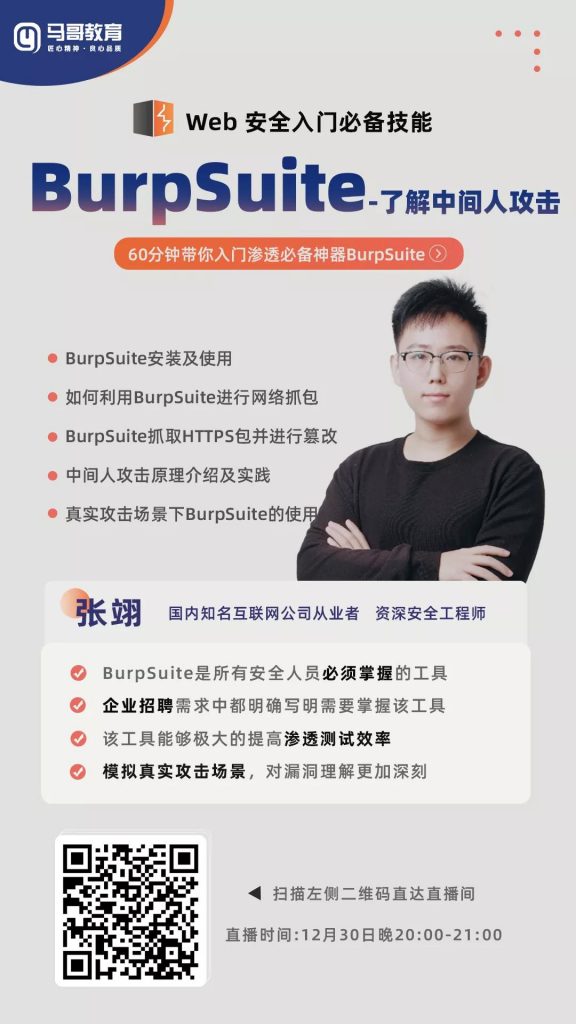所以,也请你千万不要错过12月30日(周四)晚20:00,一线大厂网安专家张翊老师的免费公开课《BurpSuite-中间人攻击》。