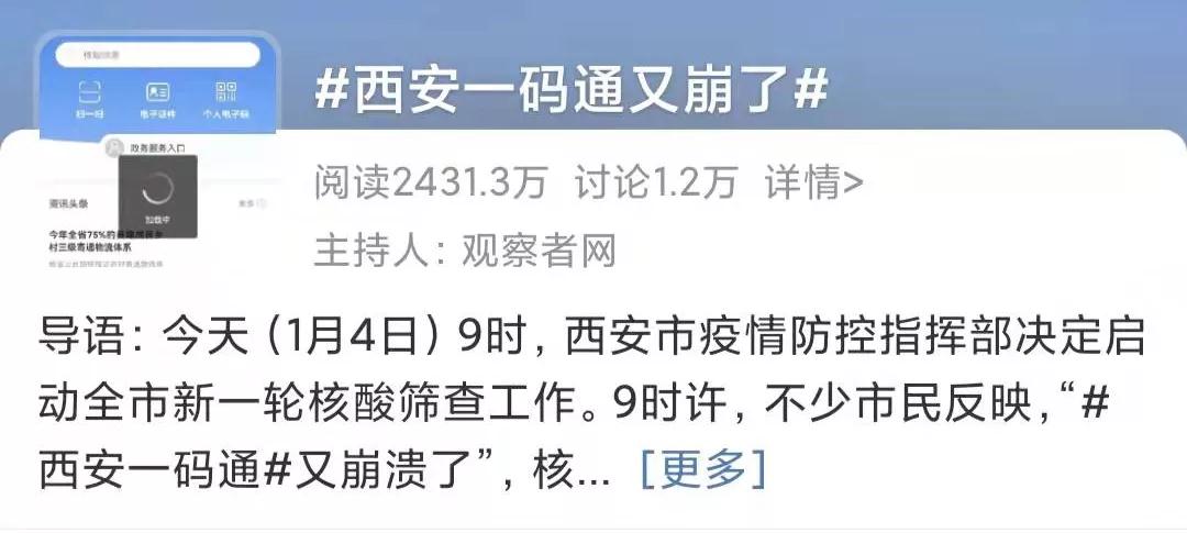 就在1月4日西安进行核酸筛查时,去年年末引起热议的“一码通”又崩溃了,一时之间,打工人陷入了进退不能的尴尬境地,程序员也开始了无奈的修复...