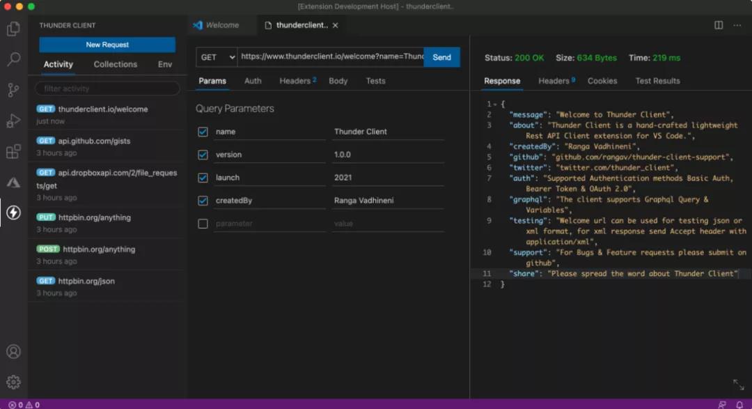 但是,在 VS Code 中测试 API 需要频繁切换思路(因为你要切换到别的应用)。Thunder Client 为我们提供了一款轻量级、易用、整洁、简单的 Rest API 客户端扩展。