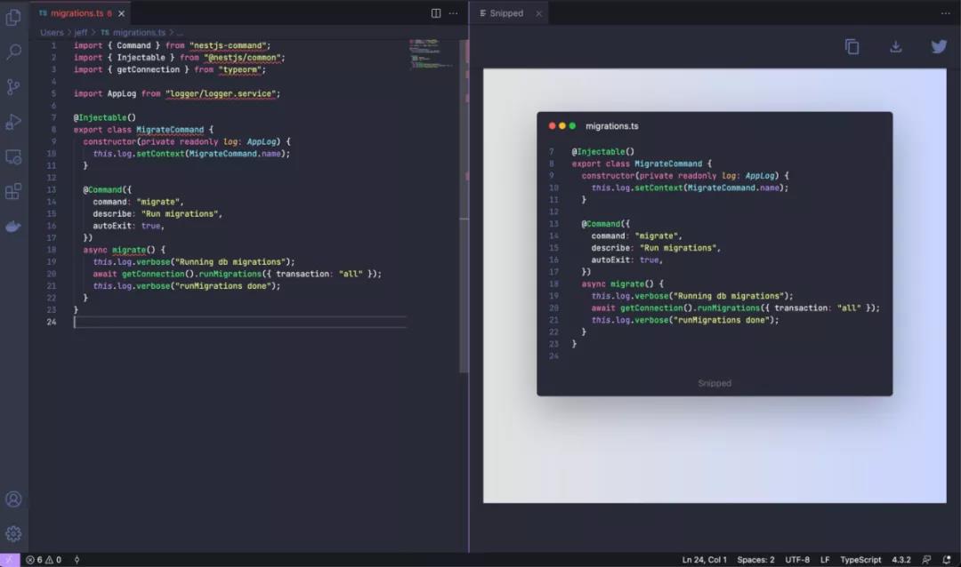 Snipped可以直接在从 VS Code 编辑器自动为我们完成这项任务。让我们告别在推特中复制粘贴代码,将代码截图直接保存到剪贴板中。