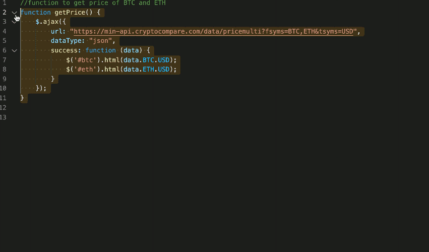 你还可以询问“current price of Bitcoin and Ethereum”(比特币和以太坊的当前价格),Copilot 就可以立即生成所需的函数。Copilot 最棒的地方在于,它几乎超越了所有其他代码片段的 VS 代码扩展。