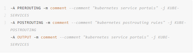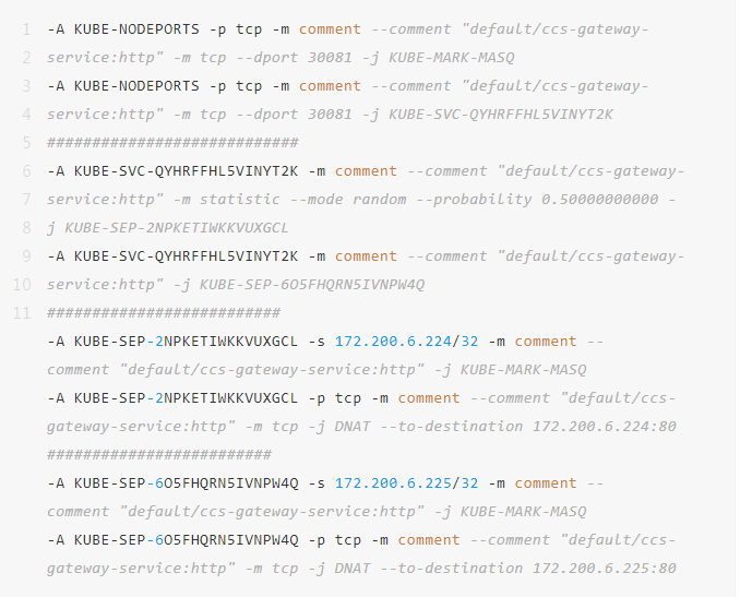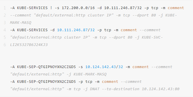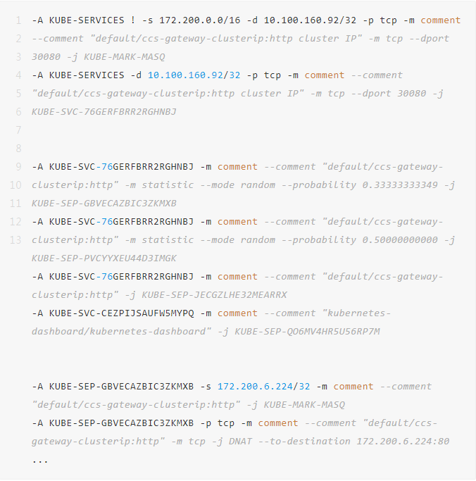 - KUBE-SERVICES->KUBE-SVC-XXXXXXXXXXXXXXXX->KUBE-SEP-XXXXXXXXXXXXXXXX represents a ClusterIP service