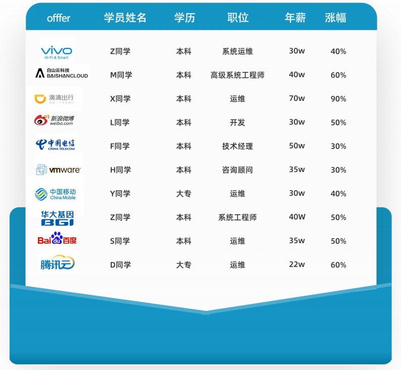 除此之外,马哥课程老师还为学习这门课的学员申请了12项就业福利!有:简历指导、模拟面试、求职真题、岗位内推等,学员毕业后还有机会获得腾讯、百度、阿里、京东、美团点评、蚂蚁金服、唯品会、新浪、头条等国内知名互联网公司的招聘资源,让就业无忧!