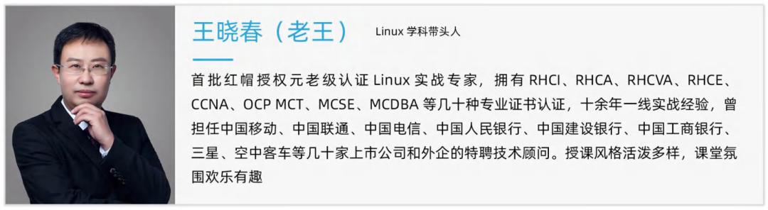 提起王晓春老师很多学员都会忍不住兴奋,王老师是linux学科的带头人,也是国内首批红帽授权元老级认证linux实战专家,这里专门给0基础的学员科普一下什么是红帽认证,(业内人可略过),红帽认证是 Linux 行业乃至整个IT领域价值最高的认证之一,王老师作为首批元老级专家,可见其功力深厚。