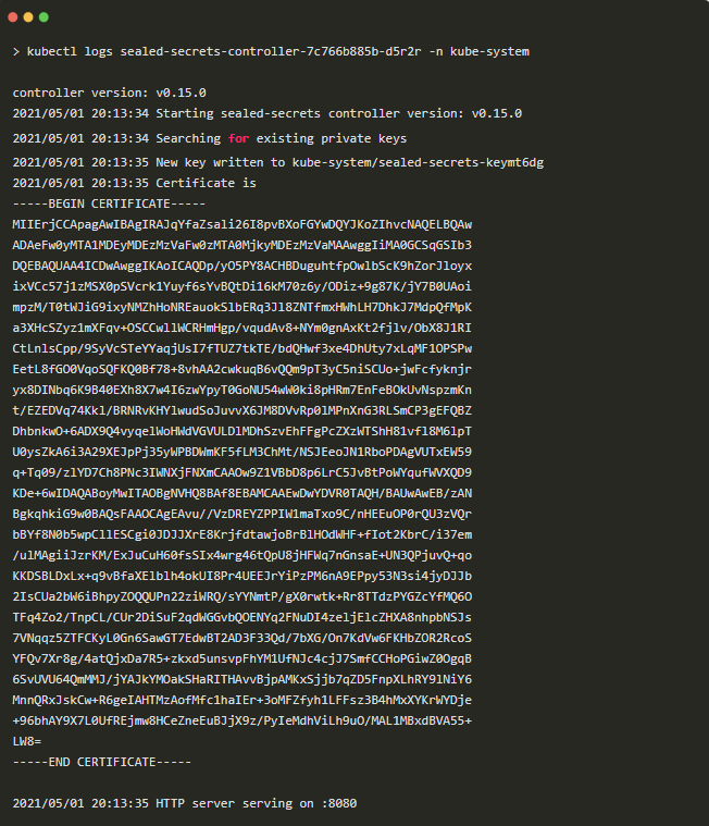 如果你查看Pod的日志,你将看到控制器为自己创建的一对秘钥,这对秘钥将被用于加解密过程。