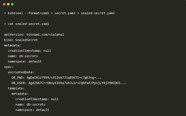 上面步骤4中创建的SealedSecret资源清单文件可以被提交到Git代码仓库中。secrets.yaml文件可以丢弃,因为它不再需要了。被存储在sealed-secret.yaml文件中的数据是安全的,它是被加密的,且只能由运行在Kubernetes集群中的Controller解密。