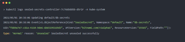 如果你再次检查控制器的日志,你将看到控制器拦截了请求,并解密来自SealedSecret的加密数据,数据被解密后,将创建Kubernetes的Secret对象。