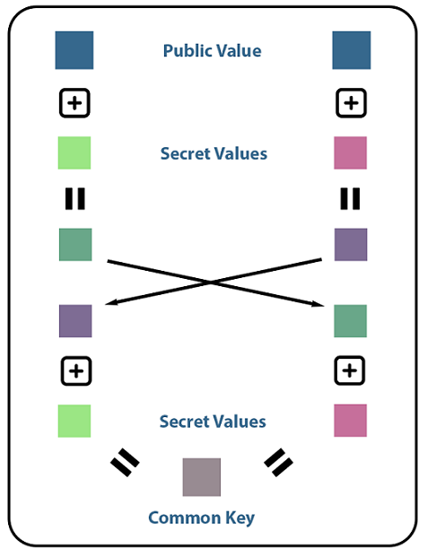 1976 年,该问题的第一个解决方案由 Whitfield Diffie 和 Martin Hellmann 提出,同时该算法被命名为 Diffie Hellmann。Diffie Hellmann 会对通信的两个成员生成相同的密钥,而不需要预先共享密钥。此过程的步骤是:
